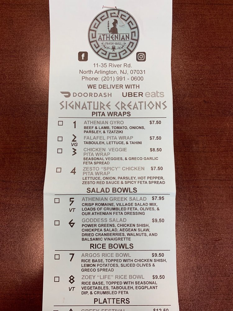 Introducing Athenian Fresh Grill, a Mediterranean gem located in North Arlington, NJ. This casual spot offers a plethora of dining options, from vegan-friendly dishes to traditional favorites. Customers rave about the fresh flavors and generous portions, with standout menu items like the Athena gyro, falafel pita, and yiayia platter. The warm and welcoming service adds to the charm of this family-friendly establishment. Whether you dine in or order delivery, you can expect mouthwatering dishes like the zesty spicy chicken pita wrap and chicken shish bowl. Don't miss the opportunity to try their homemade rice pudding and eggplant dip, a true delight for your taste buds. Athenian Fresh Grill is a must-visit for anyone craving authentic Greek cuisine in a cozy setting.